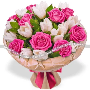 Моя нежность! - букет из тюльпанов и кустовой розы