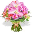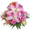 ДЕЛЮКС: лилия розовая или белая- 3 шт., хризантема кустовая фиолетовая - 7 шт., альстромерия розовая - 4 шт., альстромерия оранжевая - 14 шт., салал, упаковка натуральная зеленая, золотой бант.