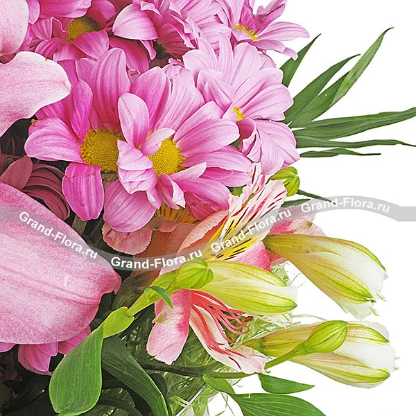 Стандартный (на фото): лилия розовая или белая - 1 шт., хризантема кустовая фиолетовая - 3 шт., альстромерия розовая - 1 шт., альстромерия оранжевая - 4 шт., салал, упаковка натуральная зеленая, золотой бант.
