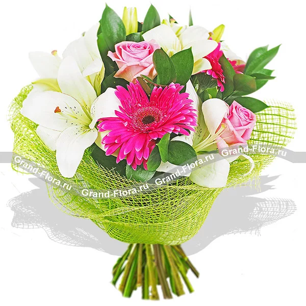 Шикарная композиция состоит из нежных розовых роз, выразительных малиновых гербер и утонченных белых лилий. Цветочное трио выгодно подчеркивает рускус и зеленая декоративная обертка из сетки.