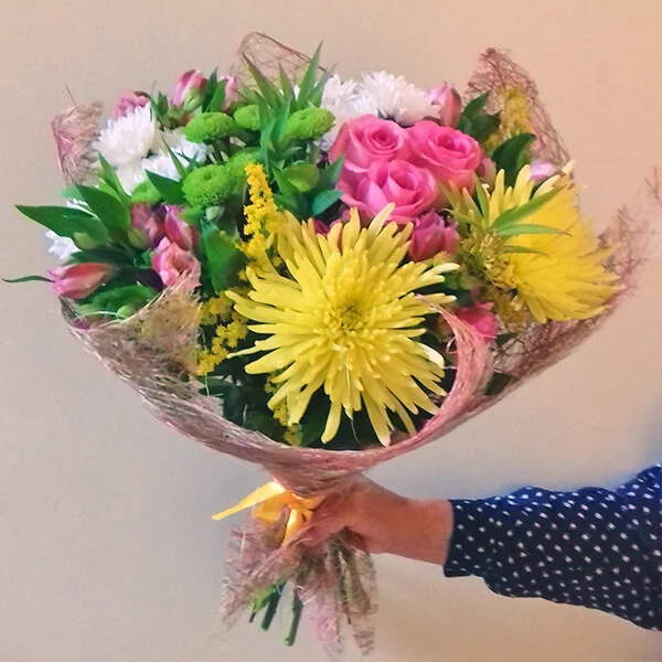 Стандартный (на фото): роза розовая (аква) - 3 шт, роза кустовая розовая - 4 шт, хризантема кустовая белая - 2 шт, хризантема кустовая зеленая(возможна замена на ромашковидную окрашенную) - 1 шт, хризантема одноголовая желтая - 2 шт, рускус, натуральная упаковка, желтый бант.Примерный диаметр букета 30х30 см.