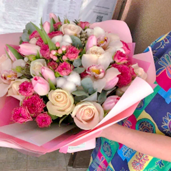 Славик / г. Кострома г. / 08.03.2025Оценка букета:Вообще не разбираюсь в цветах, но хотел порадовать сестру сюрпризом - позвонил на горячую линию и попросил сделать букет на вкус флористов. Очень понравилось что собрали все красиво и сестра порадовалась подарку. Обращусь еще!