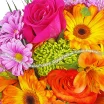 Хризантема ромашковая фиолетовая - 9 шт., гербера оранжевая - 5 шт., гербера желтая - 4 шт., роза розовая - 6 шт., роза оранжевая - 5 шт., альстромерия оранжевая - 6 шт., альстромерия розовая - 6 шт., хризантема одноголовая зеленая - 6 шт., лист рабелини - 5 шт., натуральная упаковка розовая, бант в тон.