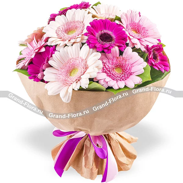 Этот прекрасный букет посвящается всем представительницам женского пола! Розовые и малиновые герберы превосходно поднимают настроение на целый день.
