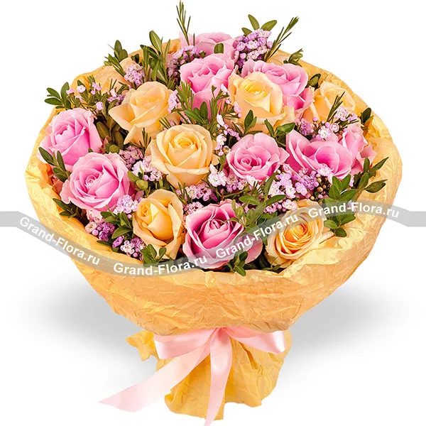 "Нежное напоминание" - букет из кремовых и розовых роз, изысканный и удивительный, воздушный,  уточнченный! Эта цветочная композиция не останется незамеченной. Вы можете выбрать любой из доступных вариантов по составу : от "уменьшенного" - такой букет станет милым комплиментом и напорминанием об искренности чувств,   до  "Де люкс" -  который поразит получателя пышностью и красотой.  Признайтесь в чувствах, поздравьте с Днем рождения, сделайте неожиданный сюрприз без особого повода - для любого случая букет из роз будет подходящим и достойным подарком!