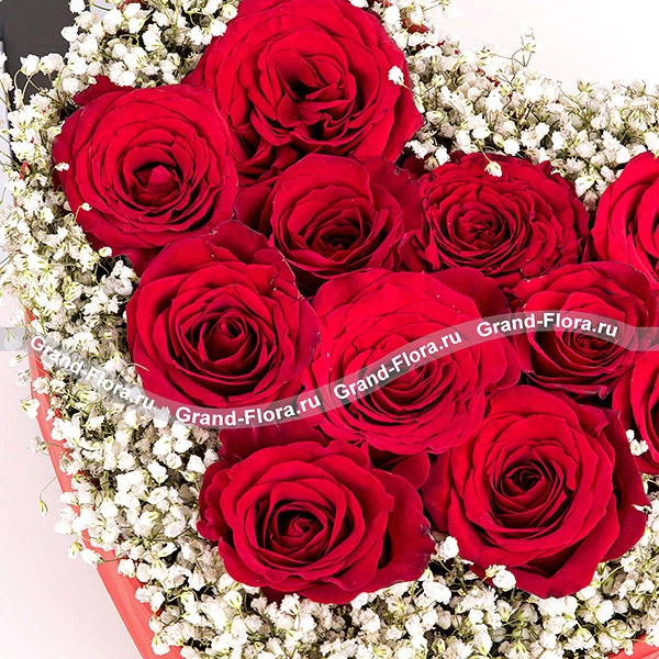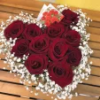 11 роз (на фото): роза красная - 11 шт., гипсофила, оазис сердце малое. Примерный размер: 25Х25 см.
