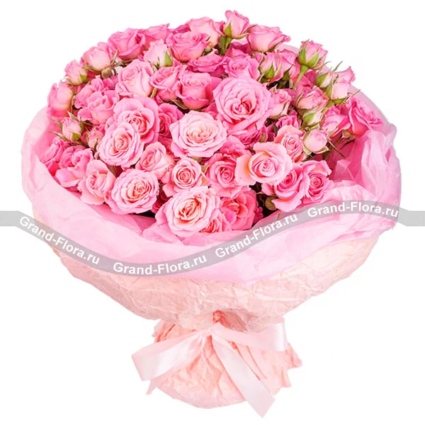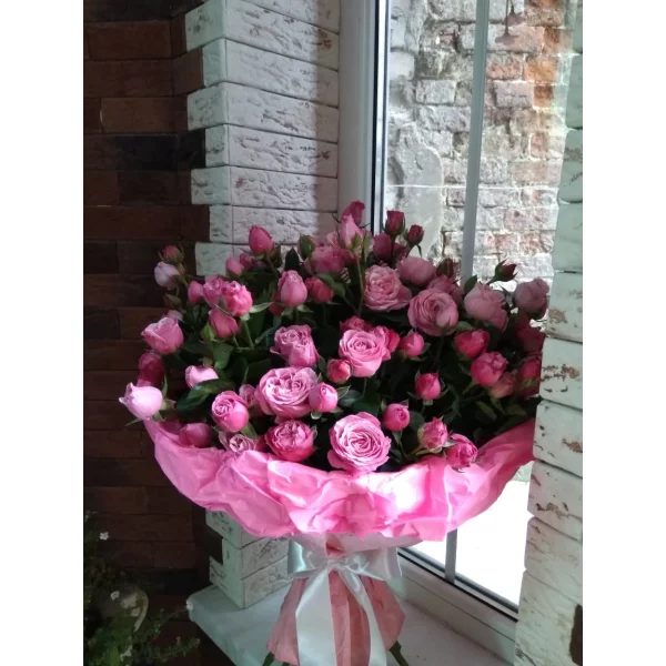 (на фото) роза кустовая розовая - 25 шт, упаковка, лента розовая. Примерный размер: 45Х45 см.