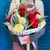 15 роз: роза красная, белая - 15 шт., эвкалипт - 4 шт., упаковка, бант