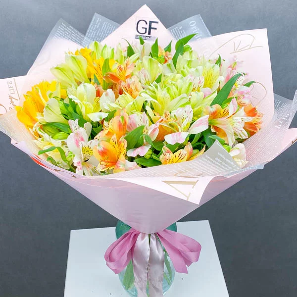 Букет состоит из альстромерии, которую еще называют перуанской лилией из-за внешнего сходства, разнообразное цветовое сочетание, в окружении декоративной зелени. Диаметр букета от 25см до 50см, в зависимости от выбранного варианты букета. Букет перевязан изящным розовым бантом. Обращаем Ваше внимание, что состав и оформление букета может отличаться.