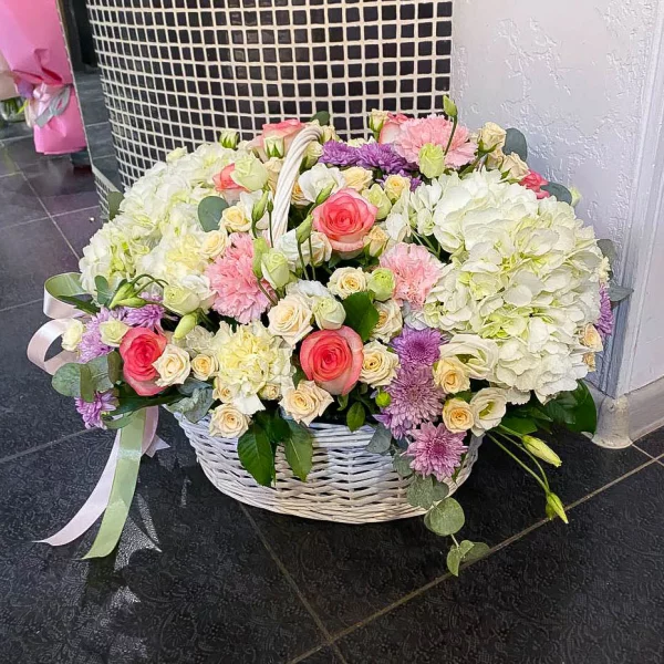 хризантема кустовая сиреневая(розовая) - 5 шт., роза кустовая белая - 4 шт., роза розовая - 5 шт., эустома белая (возможна замена на розовую) - 3 шт., диантус розовый/кремовый - 10 шт., декоративная зелень, оазис, корзина средняя.